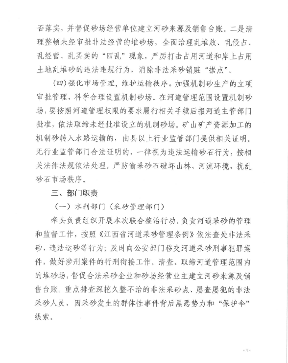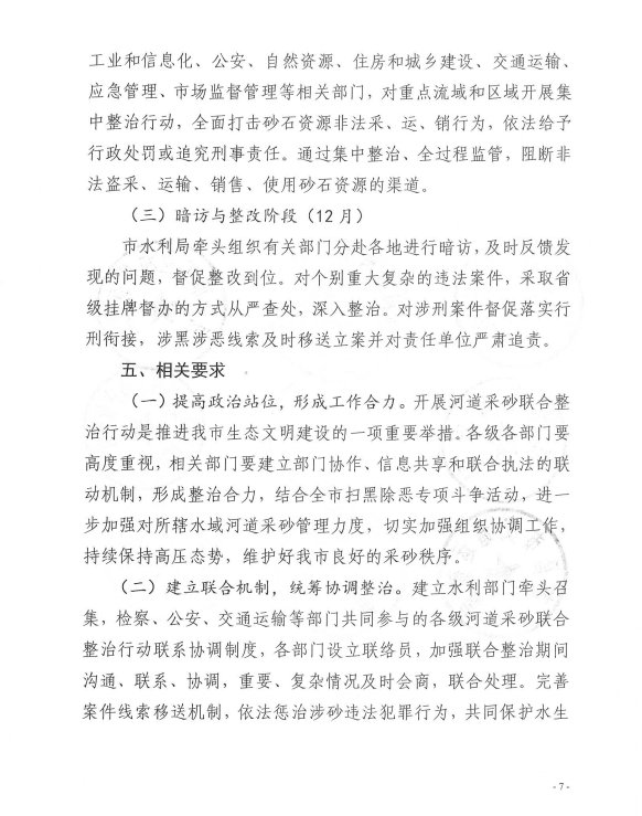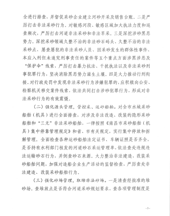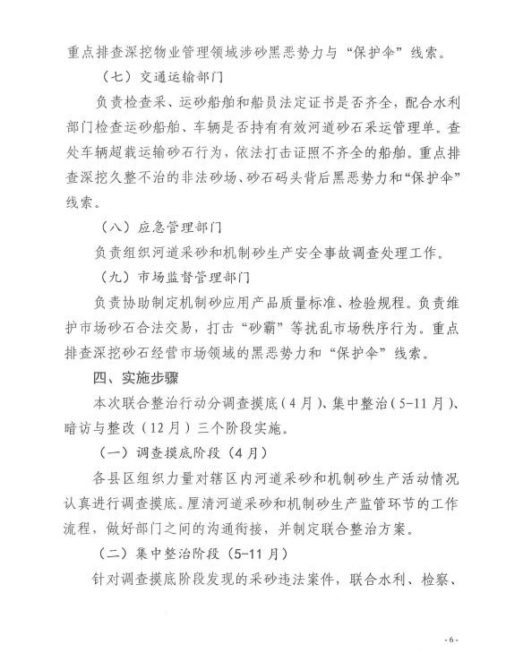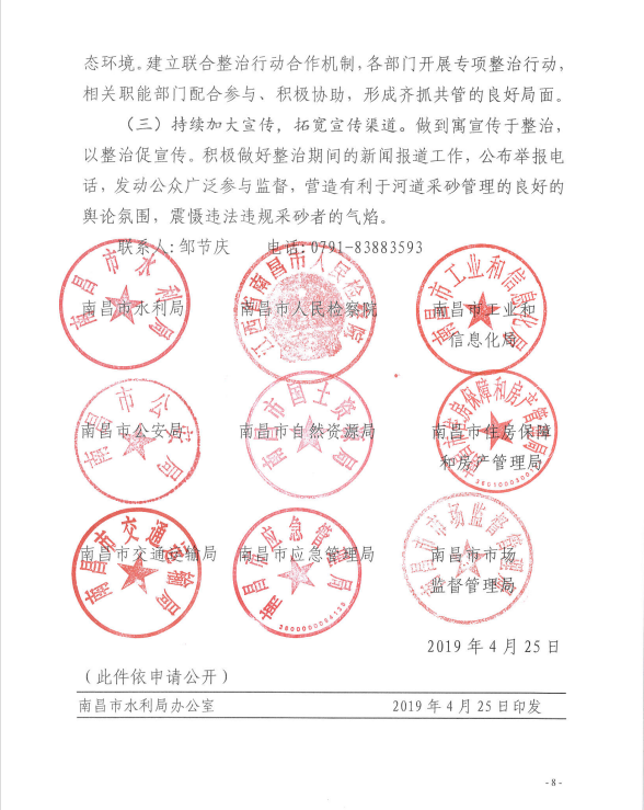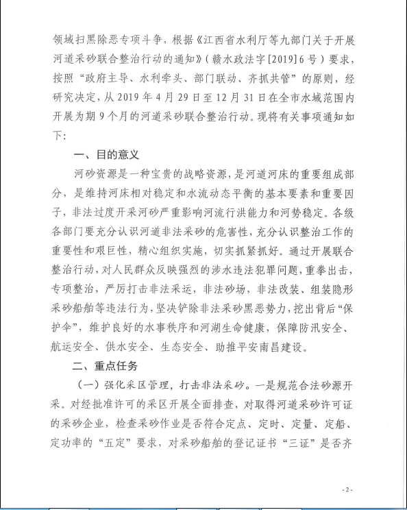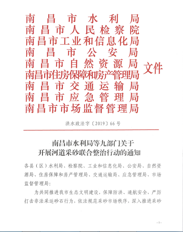 为加大水利行业监管力度,深入推进采砂领域扫黑除恶专项斗争,严厉打击非法采运砂石行为,依法规范采砂市场秩序,全面贯彻落实中央扫黑除恶第15督导组第一阶段通报问题“边督边改、立行立改”整改的要求,根据《江西省水利厅等九部门关于开展河道采砂联合整治行动的通知》(赣水政法字[2019]6号)和省水利厅召开全省河道采砂联合整治行动动员部署视频会的统一部署。在線娛樂城联合市检察院、市工业和信息化局、市公安局、市自然资源局、市住房保障和房产管理局、市交通运输局、市应急管理局、市市场监督管理局等九部门联合发文宣布,从2019年4月29日至2019年12月31日,开展为期九个月的河道采砂联合整治行动,全文如下: