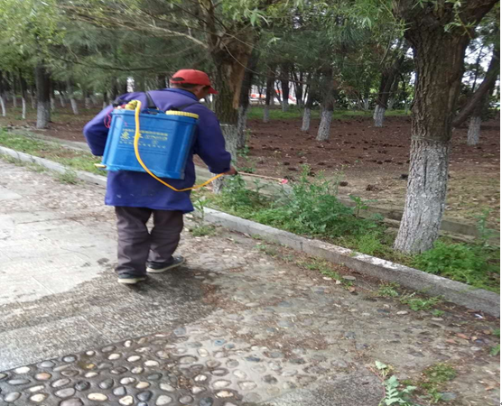 本次使用的除草剂主要成分是草甘膦,为了彻底清除杂草,保证景观树及草坪的正常生长,绿化科职工工先用割灌机剪去草根以上部分,再用配制好的草甘膦喷洒在草根上,因为将农药喷洒在草根上可使其浸入到草根内部,使草根腐烂,进而达到了除草的效果。